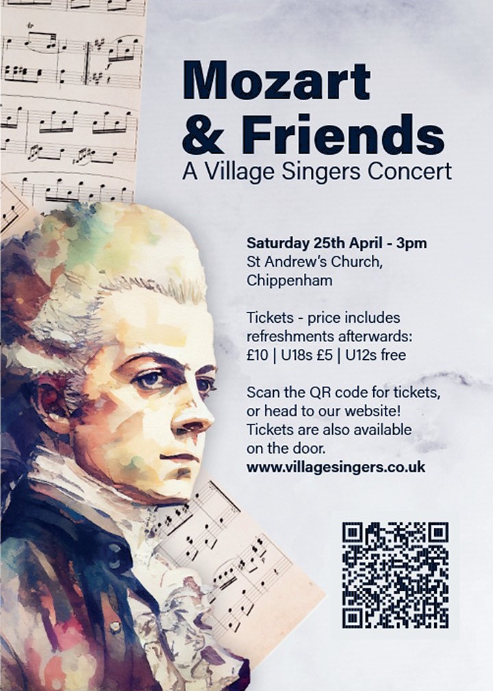 We are now busy rehearsing for our upcoming spring concert Mozart and Friends, which will be held at St Andrew’s Church, Chippenham, at 3pm on Saturday April 25th. Tickets are now available on-line or via choir members, and we would love to see you there!